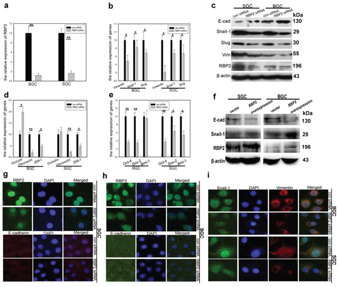 Figure 2: RBP2 regulates the expression of EMT-related and stemness-related genes. a. RBP2 mRNA is significantly inhibited with siRNA treatment in GC cells using QRT-PCR. Data are mean ± SD of 3 biological replicates, **p < 0.01 compared with negative control. b. mRNA levels of EMT-related, mesenchymal genes were decreased with RBP2 suppression using QRT-PCR. Data are mean±SD of 3 biological replicates, *p < 0.05 compared with negative control. c. Upregulation of epithelial marker (E-cadherin) and downregulation of mesenchymal markers (Snail-1, Slug and Vimentin) with RBP2 inhibition using western blot. Representative images are shown here from three independent biological replicates. d and e. QRT-PCR shows upregulation of epithelial marker (Occludin) and downregulation of mesenchymal markers (Fibronectin and ZEB-1) and stemness related genes (Sox2, Oct4 and Bmi-1). Data are mean ± SD of 3 biological replicates, * and **p < 0.05 and < 0.01 compared with negative control. f. RBP2 overexpression enhanced mesenchymal genes expression while decreased E-cadherin expression with western blot assay. g–i. g and h Upregualtion of E-cadherin with RBP2 knockdown in BGC-823 cells and SGC-7901 cells respectively using immunofluorescence. i Expression of mesenchymal markers (Snail-1 and Vimentin) is decreased when RBP2 is downregulated using immunofluorescence. Representative images are shown herefrom three independent biological replicates. Original magnification, × 100.