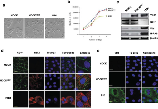 Figure 1: YBX1 overexpression induces partial EMT in MDCK cells. a. Stable expression of YBX1 in MDCK cells (MDCKYBX1) induces cells scattering (10 × magnification) b. Cell growth was monitored by counting sub-confluent cell numbers every 24 hr, over 4 days. (n = 3; average ± SEM). c. Immuno-blot analysis of epithelial (CDH1), mesenchymal (VIM), and expression of YBX1 and H-Ras. d. Confocal microscopy of CDH1 (green), and YBX1 (red) expression (scale bar = 10 μm). e. Confocal images of cytoskeletal VIM (green) (scale bar = 10 μm).