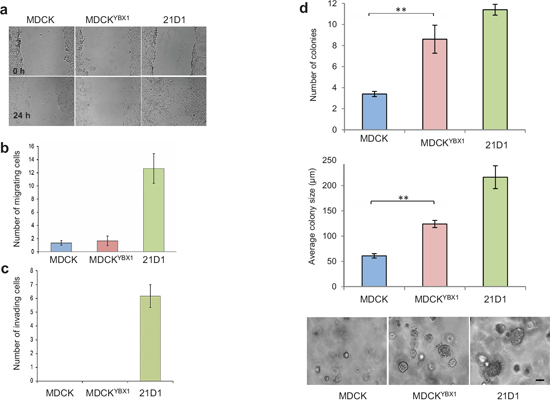 Compared to MDCK cells, a significantly elevated total number of MDCKYBX1 cell colonies were quantified in the colony formation assay. (Figure 2d). Additionally, the average size of each colony was also increased in the soft agar, indicating that YBX1 enhances cell transformation (Figure 2d).