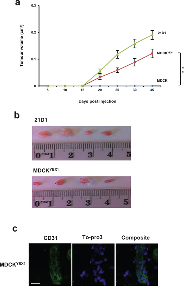 Figure 3: MDCKYBX1 cells generate tumour xenografts. a. 1 × 106 cells/site were injected subcutaneously into NOD/SCID mice, in both inguinal regions. Tumour volumes were measured at indicated times. (n = 8; average tumour volume ± SEM; **P < 0.01). b. Tumours were excised after 5 weeks, and representative images shown. c. Immunohistochemistry of CD31 (green) expression in MDCKYBX1 tumour xenografts (30 μm scale, n = 2).
