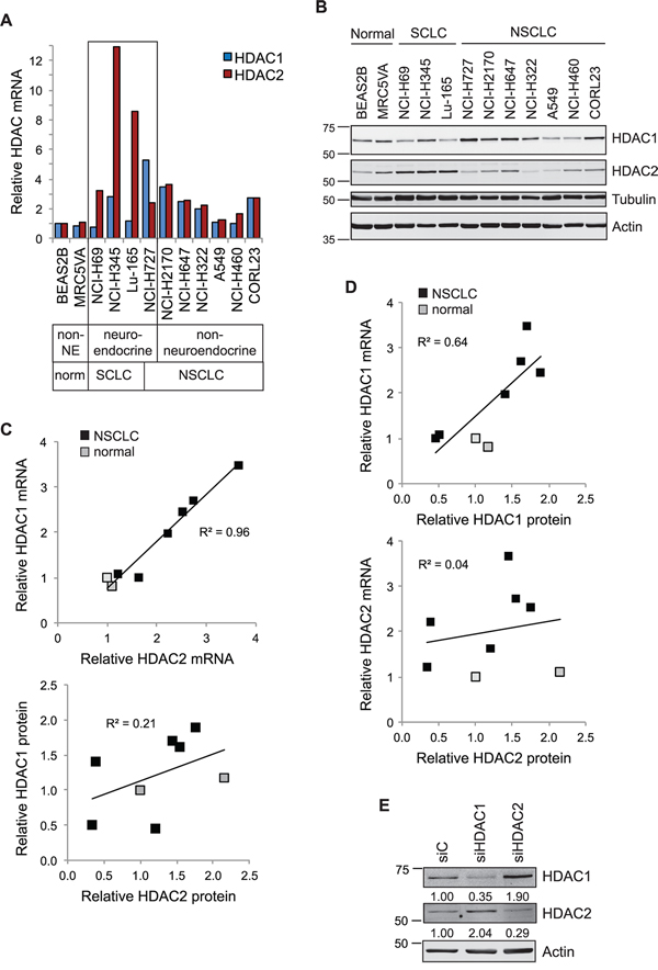 Figure 1: Interdependency of HDAC1 and HDAC2 expression in lung cancer cell lines. A. HDAC1 and HDAC2 transcript expression in lung cancer cells. RNA extracted from a panel of normal lung and lung cancer cell lines was assessed for HDAC transcript expression by qRT-PCR. Cq values for test genes were normalized to actin and expressed as 2−[ΔΔCq] relative to the BEAS2B cell line. B. Co-extracted proteins from the same cell lines were immunoblotted for HDAC1 and HDAC2. For correlation in subsequent panels, HDAC protein levels were quantified using Odyssey analysis software, normalized to tubulin and shown relative to the BEAS2B cell line. C. HDAC1 and HDAC2 transcripts (top), but not proteins (below), exhibit strong positive correlation in the NSCLC and normal lung cell lines. D. HDAC1 mRNA (top), but not HDAC2 mRNA (below), is a good predictor of protein expression. Scatter plots represent quantification of protein (x-axis) plotted against that of mRNA (y-axis). E. Depletion of HDAC1 or HDAC2 leads to isoenzyme compensation. A549 cells were transfected with 40 nM siRNAs as indicated. Whole cell protein extracts were prepared 72 hr later and equivalent amounts immunoblotted. Expression of each HDAC was normalized to actin and is indicated relative to the siC control.