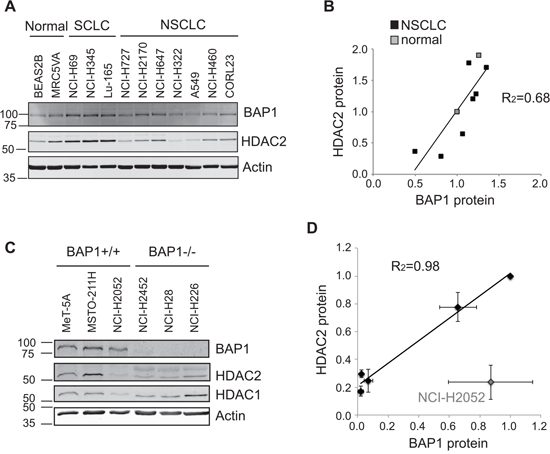 Figure 3: Endogenous BAP1 and HDAC2 expression are positively correlated. A–B. Protein extracts from the panel of SCLC, NSCLC and normal lung derived cell lines shown in Figure 1B were analyzed for BAP1 expression. A representative immunoblot A. and quantification of relative protein expression B., showing that HDAC2 protein levels correlate with those of BAP1 in non-neuroendocrine cells (linear regression R2 = 0.68). C–D. Immunoblotting in normal mesothelial cells and mesothelioma cell lines with differing genetic BAP1 status. A representative immunoblot C. and quantification of relative protein expression from three independent experiments D. show HDAC2 protein levels correlate with those of BAP1. NCI-H2052 cells are an outlier and have genetic loss of HDAC2 copy number (linear regression for other cell lines, R2 = 0.98).