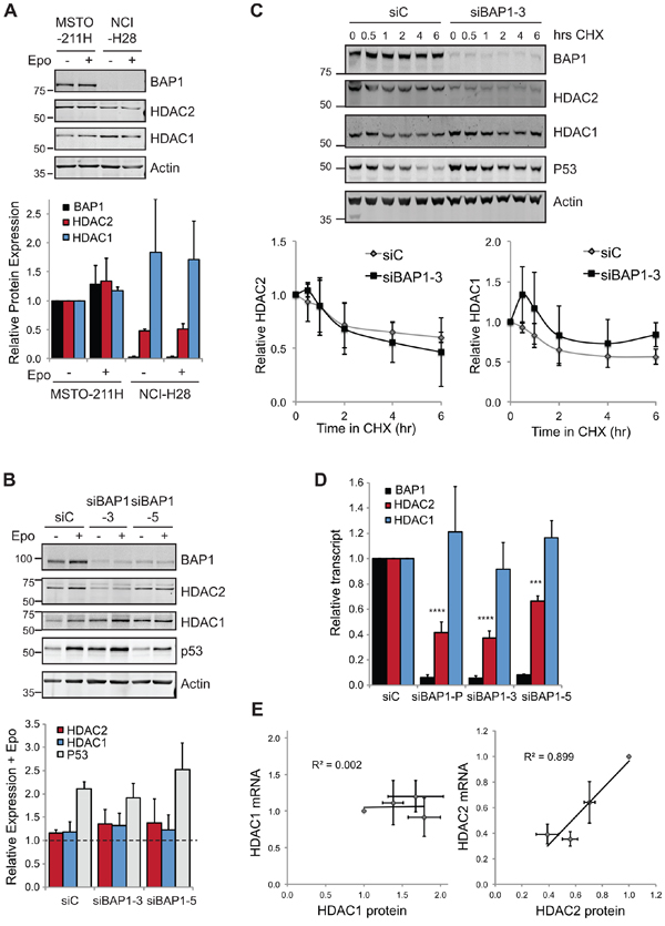 Figure 4: BAP1 regulates HDAC2 at the transcript level. A. HDAC response to proteasome inhibition. Cells were treated with 50 nM epoxomicin (Epo) for 6 hr prior to whole cell lysis and immunoblotting. A representative immunoblot (top) and quantification of proteins from three independent experiments (below), error bars show SD. B. The effect of BAP1 depletion on HDAC2 levels is not rescued by proteasome inhibition. MSTO-211H cells were transfected with siRNAs for 72 hr and treated with 50 nM epoxomicin for the final 6 hr prior to whole cell lysis and immunoblotting. A representative immunoblot and quantification of proteins showing epoxomicin treated relative to untreated for each knockdown condition (three independent experiments, error bars show SD, no significant difference was determined between samples using one-way ANOVA with Dunnett’s post-hoc test). C. BAP1 depletion does not significantly alter HDAC2 protein stability. MSTO-211H cells were transfected with siRNAs and treated with 10 μg/ml cycloheximide for the indicated times prior to whole cell protein extraction and immunoblotting. A representative immunoblot and quantification of HDACs (four independent experiments, error bars show SD, no significant difference was determined between samples by paired t-test). D. BAP1 depletion decreases HDAC2 mRNA. MSTO-211H cells were transfected with siRNAs as indicated and RNA extracted 72 hr later for qRT-PCR. Cq values for test genes were normalized to actin and expressed as 2−[ΔΔCq] relative to the siC control (three independent experiments, error bars SD, one-way ANOVA with Dunnett’s post-hoc test: ****P ≤ 0.0001, ***P ≤ 0.001). E. On depletion of BAP1, HDAC2 transcript is a good predictor of HDAC2 protein expression level.