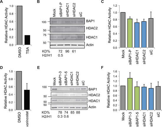 Figure 5: Neither HDAC nor BAP1 depletion alters total cellular HDAC activity. HDAC activity was assessed in A549 cells A–C. and MSTO-211H cells D–F. As positive controls, cells were A. chronically treated with 250 nM of the pan-HDAC inhibitor TSA for 16 hr (mean of two independent experiments), or D. acutely treated with 5 μM vorinostat for 2 hr (mean of three independent experiments, error bar SD). BAP1 depletion does not affect activity towards the HDAC-GloI/II substrate. Cells were reverse transfected with 20 nM siRNA as indicated for 48 hr. Immunoblotting shows efficient depletion by reverse transfection of siRNA in the 96-well assay format, B. E., the percentage efficiency for depletion of the target protein (KD%) and the ratio of HDAC2/HDAC1 expression (H2/H1) is indicated. For the HDAC-Glo assay run in parallel, C. F., data show the mean of three (C.) or four (F.) independent experiments (error bars SD, no significant difference was determined between samples using one-way ANOVA with Dunnett’s post-hoc test).