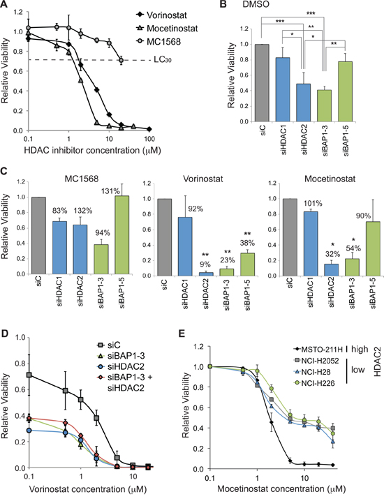 Figure 6: BAP1 status alters sensitivity of mesothelioma cells to HDAC inhibitors. A. Dose response curves for HDAC inhibitors in MSTO-211H cells. Vorinostat (broad spectrum), mocetinostat (class I) and MC1568 (Class IIa) were added to cells at the indicated concentrations for 48 hr prior to CellTitre-Glo assay (error bars show SD of 4 technical replicates). MC1568 remains in aqueous solution at concentrations below 50 μM. B–D. HDAC2 or BAP1 depletion sensitizes cells to HDAC inhibitors. MSTO-211H cells were reverse transfected with 20 nM siRNA for 72 hr, and treated with vehicle (0.1% DMSO) B. or with HDAC inhibitors C. D. for the final 48 hr, before viable cell estimation by CellTitre-Glo assay (error bars show SD for three independent experiments). B. Treatment with vehicle: relative viability is plotted, compared to cells transfected with the siC control and treated with vehicle (one-way ANOVA with Tukey’s post-hoc test: *P ≤ 0.05, **P ≤ 0.01, ***P ≤ 0.001). C. Treatment with the indicated HDAC inhibitors at their LC30: 20 μM MC1568, 2.5 μM vorinostat and 1.25 μM mocetinostat. The relative viability is plotted as a histogram for each drug treatment, this is based on comparison to cells transfected with siC and treated with that drug. For each bar on the histograms, percentage viability is also indicated, which compares the drug treated cells to the DMSO treated cells (shown in B) for the same knockdown condition; statistical significance for this comparison is shown (one-sample t-test, *P ≤ 0.05, **P ≤ 0.01). D. Dose response curves for vorinostat in HDAC2 and/or BAP1 depleted MSTO-211H cells; all data are normalized to siC transfected cells in 0.1% DMSO. E. Dose response curves for mocetinostat in a panel of mesothelioma cell lines with high (MSTO-211H) or low (other cell lines) constitutive HDAC2 expression. Data are normalized to 0.1 μM treatment for each cell line (error bars show SD for three independent experiments).