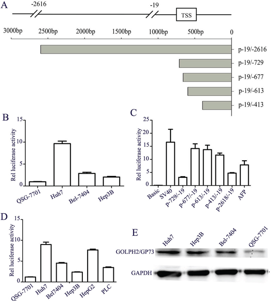 Figure 1: Analysis of GOLPH2 promoter activity and its expression in HCC cell lines. A. The diagram pattern of human GOLPH2 promoter and its different truncations. B. Activity detection of human GOLPH2 promoter with F-2618/-19. Three hepatocellular carcinoma cell lines Huh7, Bel-7404, Hep3B and normal liver cell line QSG-7701 were transiently transfected with pGL3-L1 (large GOLPH2 promoter fragment F-2618/-19) and pRL2 was co-transfected as an internal control. Luciferase activities were calculated in relation to background activity of pGL3-basic. C. Truncations analysis of GOLPH2 promoter. A series of promoter truncations are represented with different numbers and their Luciferase activities are shown relative to pGL3-basic activities in Huh7 cells. D. The activity of the 659 bp truncation promoter p-677/-19 was detected in five HCC cell lines and normal liver cells according to the above methods. E. Expression of GOLPH2 protein was detected by western blotting analysis in three HCC cell lines and normal liver cell line.