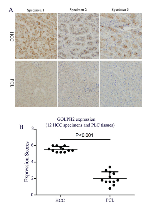 The HCC specimens and the paracancerous liver (PCL) tissues were collected from 12 patients after undergoing clinical operation, and GOLPH2 expression was detected by immunohistochemistry analysis. The expression of GOLPH2 was positive in all HCC specimens, including strongly positive, moderately, and weakly positive (Figure 2A). Nevertheless, GOLPH2 expression in the PCL tissues was significantly weakened compared with HCC tissues, further indicating the liver cancer specificity of GOLPH2 expression.