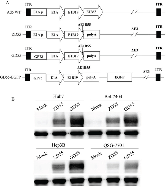 Human GOLPH2 promoter is active in liver cancer cells, but low in normal liver cells (Figure 1), which makes GOLPH2 promoter a promising candidate for designing HCC-specific oncolytic adenoviruses. Here, we constructed a cancer-targeted dual-regulated oncolytic adenovirus GD55, which characterizes with the replacement of the normal E1A transcription regulatory elements using 659 bp truncation of GOLPH2 core promoter, and the deletion of E1B 55kDa gene. The genome of the recombinant adenoviruses was depicted in figure 3A. In GD55, E1B 55kDa gene was removed and similar with oncolytic adenovirus ONYX-015, which was reported to enhance the viral mRNA late nuclear transport and oncolysis [10].