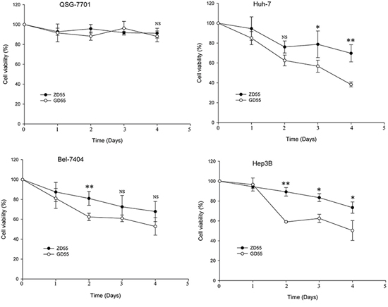 Figure 7: Cell viability of time-dependent by GOLPH2 promoter-regulated oncolytic adenovirus GD55. Three HCC cell lines (Huh7, Bel-7404, and Hep3B) and normal cell line QSG-7701 were infected with GD55 or ZD55d at a MOI of 5. On the day 1, 2, 3, and 4 postinfection, cell viability was measured with MTT assay. Results are presented as mean ± SD (n = 3) and are expressed as the percentage relative to mock-treated control cells.
