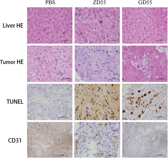 Figure 9: GD55 induced cell death in vivo. Histological analysis of tumor sections in GD55, ZD55, and PBS groups for Huh7 tumor xenograft. The upper two rows are hematoxylin and eosin staining analysis for animal liver and tumor tissues, indicating that hepatotoxicity or cell necrotic area in tumors. The third row is TUNEL assay for detecting apoptotic cells in tumor tissues. GD55 induced more apoptosis of tumor cells. The brown color represents the apoptotic cells. The bottom row showed the immunohistochemical staining for vessel marker CD31, indicating that vessel growth in tumors treated with GD55 was significantly suppressed compared with the control-treated groups. Original magnification: × 200.
