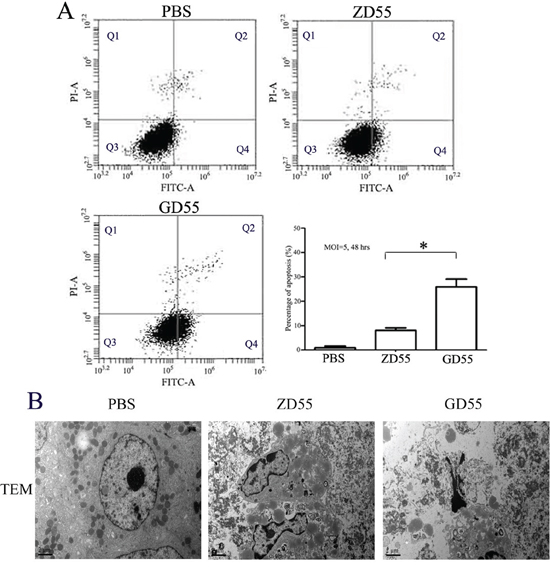 Figure 10: Apoptotic inducement in Huh7 cells by GD55. A. Annexin V binding assay. The Huh7 cells were infected with PBS, ZD55 or GD55 at an MOI of 5. 48 h later, the cells were stained with annexin V-FITC immediately followed by flow cytometry for apoptosis assay. Each value represents the mean of three wells. * < 0.01. B. Morphological observation of tumor tissue for cell apoptosis by TEM analysis. The obvious apoptosis was detected in tumors treated with GD55, secondly ZD55 than PBS treatments, such as nuclear collapse, appearance of nucleus deformation, and chromatin condensed in lumps et al.