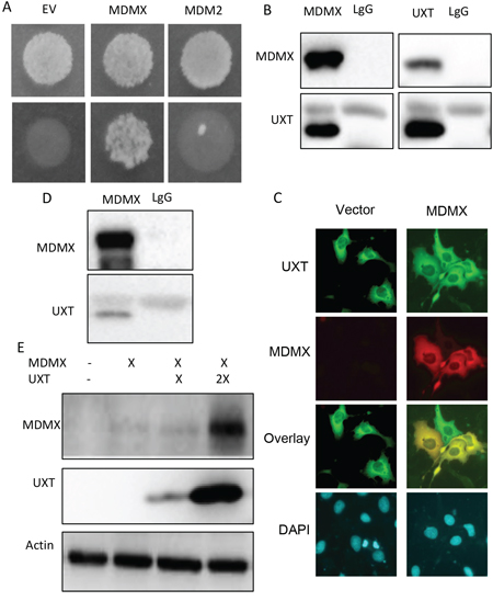 Figure 1: UXT binds to and stabilizes MDMX. A. A result of a yeast 2-hybrid assay indicating a positive clone pull out by a bait of MDMX but not MDM2. B. 293 cells were coexpressed with plasmids encoding a Flag-UXT and MDMX. The cells were harvest 24 h after transfection and subjected to reciprocal immunoprecipitations with an anti-Flag (M2 Sigma) or MDMX (Bethyl lab), with lgG included as a control. The immunoprecipitates were analyzed by Western analysis using anti-Flag or anti-MDMX antibodies. C. U2OS cells were transfected with either GFP-UXT or RFP-MDM alone to together. The cells were fixed 24 h later. Images were taken under a fluorescent microscope and representative images including overlay ones are shown. D. U2OS cells were subjected to anti-MDMX immunoprecipitation with LgG included as a control. The immunoprecipitates were immunoblotted with either anti-MDMX or anti-UXT. E. 293 cells were transfected with a control vector or 1 μg MDMX with 1 or 3 μg of Flag-UXT. The cells were harvested 24 h later and analyzed by Western blot with the indicated antibodies.