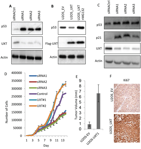 Figure 2: UXT functions as an oncogene via suppression of p53 activity. A. U2OS cells were transfected with either control siRNA (siRNACtrl) or 2 independent siRNA sequences targeting different region of the UXT gene. The cells were harvested 48 h later and analyzed for protein expression by Immunoblot using the indicated antibodies. B. UOS cells stably expressing an empty vector (EV) or UXT were established. The U2OS_UXT cells were treated with or without MG132 (10 μM) for 6 h prior to harvesting for Western analysis using the indicated antibodies. C. U2OS cells were transfected as in A and harvest 50 h later for Western analysis using the indicated antibodies. D. U2OS cells transfected with each of siRNA(1, 2 or 3) or 2 different patches of UXT overexpressing U2OS cells (UXT#1 or #2) were measured the rate of cell proliferation using a proliferation assay kit (Gibco). E. Balb C nude mice (4–6 weeks) were subcutaneously implanted with 2 X 106 U2OS_EV or U2OS_UXT cells. The tumors were harvested 8 weeks later and the volumes were measured. The numbers are averages from a group of 5 mice ± standard deviation. F. The harvested tumor tissues were subjected to immunohistochemistry staining with an anti-Ki67 antibody. The representative images were shown.