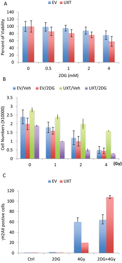 Figure 5: U2OS_UXT cells depend on glycolysis for cell survival. A. U2OS_EV or U2OS_UXT cells were treated with or without 2-DG at the indicated concentration for 48 h. Cell viability was determined and the data are means ± SD from 3 experiments performed in triplicates. B. U2OS_EV or U2OS_UXT cells were pre-treated with vehicle (Veh) or 2-DG (2mM) for 6 h followed by irradiation at the indicated dose. Cell numbers were determined 72 h after irradiation. Data are means ± SD from 3 experiments performed in triplicates. C. U2OS_EV or U2OS_UXT cells were pre-treated with vehicle (Veh) or 2-DG (2mM) for 6 h followed by irradiation at a dose of 4Gy. The cells were fixed 1 h after irradiation and stained with γH2AX. The numbers of γH2AX-positive cells were counted from 5 random fields. Data are means ± SD from 3 experiments performed in triplicates.