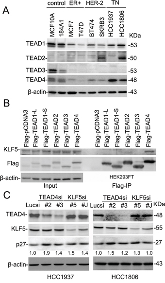 In this study, we investigated the expression and roles of TEADs in breast cancer and found that TEAD1 and TEAD4 are widely expressed in several breast cancer cell lines, particularly TNBC lines. We also found that TEAD4 specifically interacts with KLF5, and that knockdown of either TEAD4 or KLF5 in two TNBC cell lines upregulated the expression levels of the CDK inhibitor p27, while depletion of either TEAD4 or KLF5 activates the p27 gene promoter and increased the p27 mRNA levels. Endogenous TEAD4 and KLF5 bind to the p27 promoter. Depletion of p27 partially rescued TEAD4 or KLF5 knockdown induced cell growth inhibition. Finally, TEAD4 overexpression in HCC1937 significantly promotes DNA synthesis and tumor growth. Stable knockdown of TEAD4 in HCC1806 significantly inhibits DNA synthesis and tumor growth.