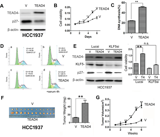 Figure 2: TEAD4 overexpression promotes TNBC cell proliferation and tumor growth. A. Stable overexpression of TEAD4 decreased the p27 protein expression level in HCC1937. B. TEAD4 overexpression significantly promoted HCC1937 cell growth, as determined by the SRB assay. **p < 0.01, t-test. C. TEAD4 overexpression significantly (p < 0.01) increased DNA synthesis in HCC1937 cells, as measured with a Click-iT EdU Alexa Fluor Imaging Kit. D. TEAD4 overexpression significantly increased G1/S cell cycle transition in HCC1937 cells, as measured by PI staining and flow cytometry. a&c, the cells were arrested at the G1 phase by serum starvation. b&d, the arrested cells were stimulated with 10% serum for 4 hours. E. TEAD4 promotes cell proliferation in part through KLF5 in HCC1937 cells. KLF5 was transiently knocked down in HCC1937-pBabe and HCC1937–pBabe-TEAD4 cells. Western blot results are shown on the left side and cell viability data are shown on the right side. **, p < 0.01, n.s., not significant, t-test. F. Tumor masses harvested from HCC1937-pBabe and –pBabe-TEAD4 after tumors had grown for 6 weeks. TEAD4 overexpression significantly increases xenograft weight (right panel). G. TEAD4 overexpression significantly promotes tumor growth in female NOD-SCID mice.