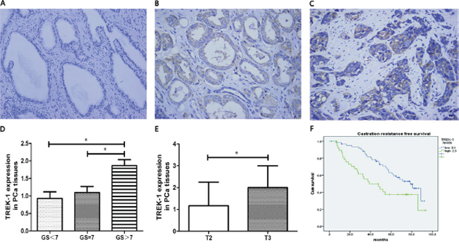 Figure 1: TREK-1 is overexpressed in PCa tissue and is associated with poor prognosis. Immunohistochemistry staining showed overexpressed TREK-1 levels in PCa tissue B, C. compared with normal prostate tissue A. TREK-1 levels were positively associated with GS D. and T staging E. (*P < 0.05). F. Castration resistance free survival in patients with high levels of TREK-1 was significantly worse than the corresponding value in those with low levels of TREK-1.