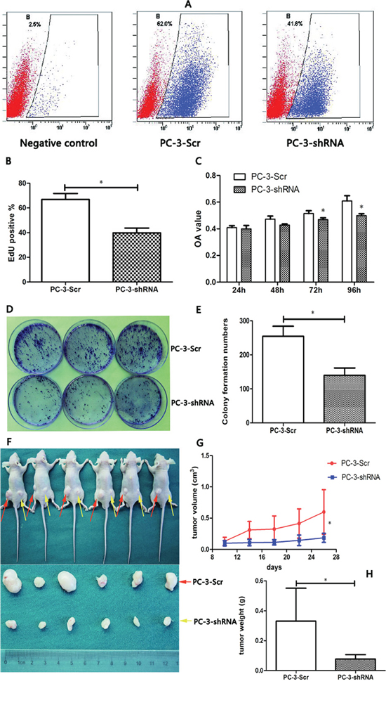 Figure 3: TREK-1 knockdown significantly inhibits cell proliferation in PCa cells in vitro and in vivo. A, B. Cell proliferation was detected in PC-3-Scr and PC-3-shRNA cells using EdU assay and analyzed by flow cytometry. C. A CCK-8 assay was performed to measure cell proliferation in TREK-1 knockdown PC-3 cells and controls. Data represent the mean ± standard deviation of the optical density value detected at 450 nm from three independent experiments. D, E. Colony formation assays showed fewer colonies in TREK-1 knockdown PCa cells. PC-3-Scr cells and TREK-1/PC-3-shRNA cells were injected into the left and right posterior flank of nude mice, respectively F. The tumor volume G. and mass H. in the PC-3-shRNA group were significantly lower than in the PC-3-Scr group (*P < 0.05).