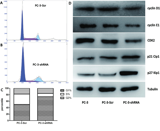 Figure 4: TREK-1 knockdown induces G1/S phase cell cycle arrest in PCa cells. The proportion of cells in G1 phase increased significantly in PC-3-shRNA cells compared with controls, while the proportion of cells in the S phase was notably less than the controls A, B, C. (*P < 0.05). D. Decreased cyclin D1, cyclin E1 and CDK2 levels, as well as elevated p21 Cip1 and p27 Kip1 levels were detected in TREK-1 knockdown PCa cells compared with controls.