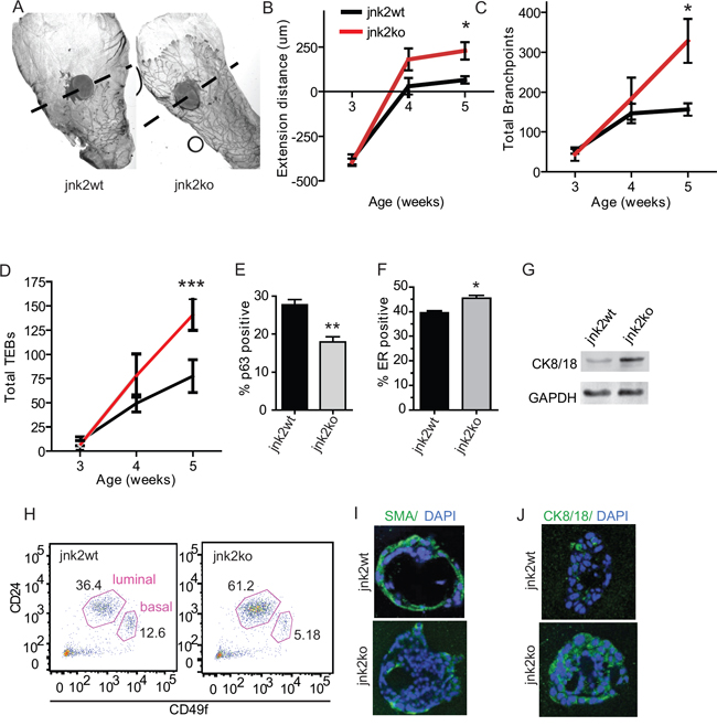 Figure 1: Absence of JNK2 accelerates pubertal mammary development and alters mammary cell differentiation. A. Representative whole mounts of mammary glands from jnk2wt and jnk2ko mice at puberty (5 wk-old); B-D. Quantification of ductal extension, branching, and total terminal end buds from pre-puberty (3wk-old) and puberty (n = 5); E-F. Quantification of p63+ basal cells and ER+ luminal cells in adult ducts (n = 3); G. Western blot of CK8/18 expression in adult mammary organoids; H. Representative CD24 and CD49f staining of adult mammary cells; I-J. Representative images of Smooth Muscle Actin (SMA)+ and CK8/18+ in 3D cultures. Nonparametric t-tests were performed for all analyses except Linear Regression analysis was used for D. *p < 0.05, **p < 0.001, ***p < 0.0001.