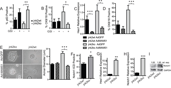 Figure 2: Elevated Notch1 in jnk2ko glands and mammary cells increases luminal cell populations. A-C. 3D cultures were grown in the presence of Gamma Secretase Inhibitor (GSI) or DMSO and probed for p63+ basal A or CK8/18+ luminal cells B; C Isolated mammary cells in suspension were infected with adenoviral vectors encoding GFP (AdGFP) or AdMAM51 and grown in 3D culture. Hes1 expression was measured by qPCR in harvested cultures; D. CK8/18+ luminal cells were assessed by immunofluorescence in 3D cultures; E. Acinar diameter of 3D cultures was determined; G. Pubertal glands were probed for Notch1-ICD and analyzed within terminal end buds; F-H. Organoid RNA was analyzed for Hes1 G and Notch1 H expression using qPCR; I. Western blot of Notch1 protein in organoid samples. 1 Way ANOVA with post-hoc t-test was performed. Post-hoc nonparametric t-test was also performed for *p < 0.05, **p < 0.001, ***p < 0.0001.