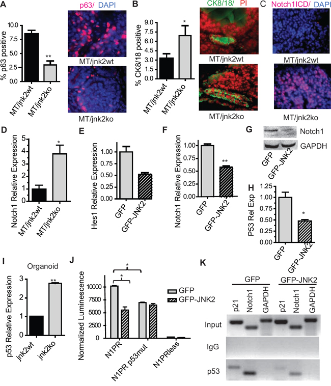 Figure 3: Absence of jnk2 in MT tumors increases luminal cell populations and enhances p53 and Notch1 expression. A-B. Representative images and quantification of p63+ A or CK8/18+ B cells in MT tumors (n = 5 per genotype); C. Representative images of Notch1ICD+ cells in MT tumors; D. Notch1 expression by qPCR in MT tumors; E-F. Hes1 E and Notch1 F expression by qPCR in MT/jnk2ko cells; G. Western blot of full-length Notch1 in MT/jnk2ko GFP and GFP-JNK2 cells; H. p53 expression in MT/jnk2ko GFP and GFP-JNK2 cells by qPCR; I. p53 expression in normal mammary organoids by qPCR; J. MT/jnk2ko cells were transfected with Notch1 promoter constructs and analyzed for promoter activity (N1PR= wildtype Notch1 promoter, N1PRp53mut = Notch1 promoter with mutated p53 response elements, N1PRless = promoter-less control plasmid); K. Chromatin Immunoprecipitation assay of p53 binding to p53 response elements within the p21 and Notch1 promoters in MT/jnk2ko cells. Gapdh promoter used as negative control. 1 Way ANOVA with post-hoc t-test was performed for J followed by post-hoc t-test. Nonparametric t-test was performed for all others, *p < 0.05, **p < 0.001.
