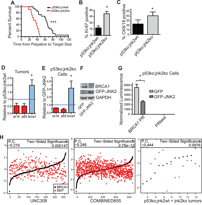 Figure 4: Absence of jnk2 increases the luminal cell population and BRCA1 expression in p53ko tumors. A. p53ko tumors were measured until reaching 1.5 cm diameter (n = 22 p53ko;jnk2wt, n = 18 p53ko;jnk2ko, Log rank test); B-C. p53ko tumors were immunostained and Ki-67+ and CK8/18+ cells were quantified (n = 5); D-E. Expression of basal (red) and luminal (blue) markers was measured in p53ko tumors (n = 8, E) and p53ko cell lines F. Western blot of BRCA1 expression in p53ko cells; G. p53ko cells were transfected with Brca1 promoter (BRCA1PR) or promoterless control (PRless) luciferase plasmids and assayed for promoter activity; H. Correlation of Brca1 expression and EMT-related gene expression was assessed in human tumors (UNC308, n = 308, and COMBINED855, n = 855) and p53ko mouse tumors (n = 15, P.C. = Pearson Correlation). A nonparametric, two-tailed t-test was used to detect statistical differences between two groups. The Pearson’s correlation was performed using data in H. *p < 0.05, **p < 0.001, ***p < 0.0001.