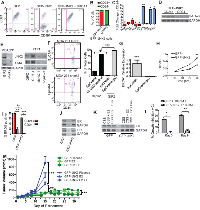 Figure 5: JNK2 increases putative tumor initiating cells and inhibits ER expression in p53ko mouse and mutant p53-expressing human cells. A. CD24/CD49f staining was compared in p53ko cell lines by flow cytometry; B. The percentage of CD24- and CD24+ cells were assessed in p53ko;jnk2ko GFP-JNK2 cells that were gated for GFP expression (medium and high) by flow cytometry; C. CD24+ and CD24- populations in p53ko;jnk2ko GFP-JNK2 cells were separated by FACS and expression of EMT/stem (red) and differentiation (blue) markers measured by qPCR; D. CD24+ and CD24- populations in p53ko;jnk2ko GFP-JNK2 cells were tested for Gata-3 expression by RT-PCR; E. shJNK2 or GIPZ non-silencing plasmids were stably expressed in mutant p53-expressing MDA 231 and 21PT cell lines. JNK2 and SMA expression were measured by western blot; F. MDA 231 cells were assessed for EpCAM and CD44 expression; G. EpCAMhi and EpCAMneg/lo populations in MDA 231 cells were separated by FACS. Brca1 was measured by qPCR; H. Cell viability of p53ko cells was evaluated using MTT assay; I. p53ko cells were pulse labeled with BrdU. BrdU incorporation in CD24+ and CD24- populations was measured; J. Western blot of ER and PR expression in p53ko cells; K. p53ko cells were cultured with charcoal stripped serum (CSS), CSS + Estradiol (E2), or CSS + E2 + Fulvestrant (F) and ER expression was measured by western blot; L. p53ko cells were cultured in full medium with or without F. Cell viability was measured at times indicated. Suppression of growth is shown as percentage of DMSO control growth for each genotype; M. Effect of E2 and E2-F treatment on orthotopically growing p53ko;jnk2ko GFP and GFP-JNK2 cells.