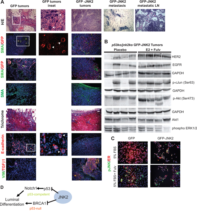 Figure 6: Histologic and western blot analysis of GFP and GFP-JNK2 tumors. A. Tumors or contralateral glands were fixed and paraffin embedded and later stained with H/E or Masson’s trichrome or probed with GFP, SMA or e-cadherin primary antibodies. Cell nuclei were co-stained with DAPI (blue) when probed with SMA, GFP or e-cadherin primary antibodies; B. GFP-JNK2 tumor lysates were subjected to western blot analysis and probed with indicated antibodies; C. GFP and GFP-JNK2 cells were cultured in 5% FBS with or without fulvestrant (Fulv) for 48 hours. p-JNK (green) and ER (red) were detected using immunocytochemistry; D. Proposed model of the mechanism by which JNK2 inhibits luminal commitment of mammary epithelial cells.