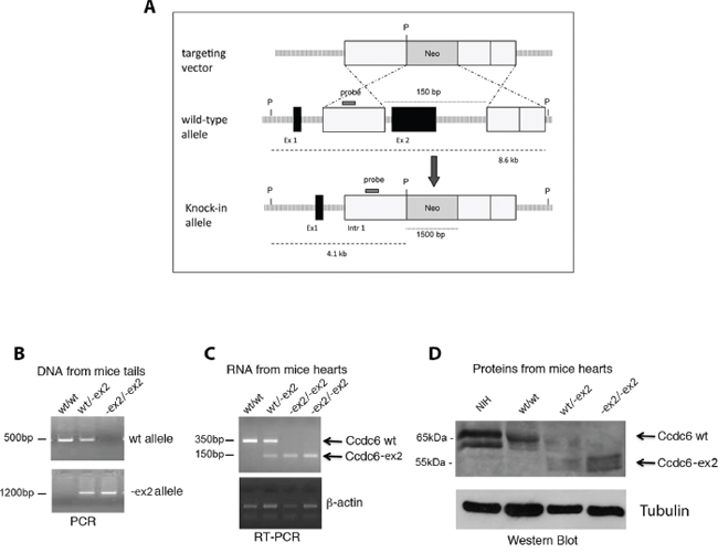 Figure 2: Generation of Ccdc6-ex2/-ex2 knock-in mice. A. Schematic representation of the endogenous wt allele, the targeting vector and the resulting Ccdc6-ex2 allele. P, Pst1; Neo, neomycin; Ex, exon, Intr, intron. B. The genotyping of Ccdc6 mice was performed using PCR analysis of DNA extracted from mice tails. C. RT-PCR analysis of total RNA extracted from hearts of Ccdc6 mice. D. Western blot analysis of Ccdc6 proteins in hearts of wt and knock-in mice. Gamma-tubulin was analyzed to evaluate equal protein loading. NIH lysate extracts have been utilized as a control of the murine Ccdc6 weight, recognized by a specific anti-CCDC6 antibody, that we generated (anti-C16-R).