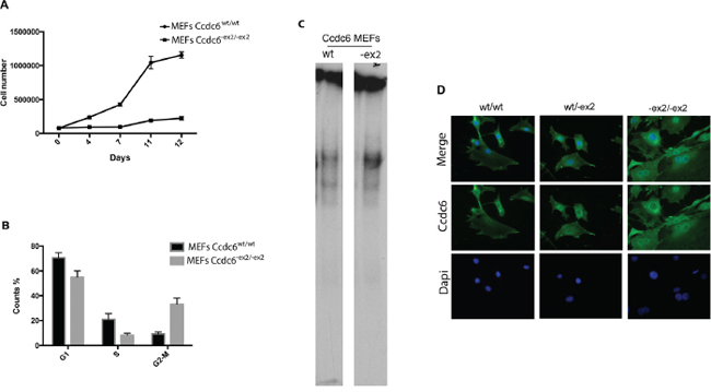 Ccdc6-ex2/-ex2 mouse embryonic fibroblasts (MEFs) showed a reduced rate of growth and an increased susceptibility to apoptosis compared to the Ccdc6 wt counterparts