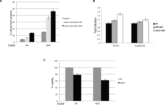 Figure 4: Ccdc6-ex2/-ex2 MEFs are more susceptible to apoptosis than wt MEFs. A. Apoptosis analysis in Ccdc6wt/wt and Ccdc6-ex2/-ex2 MEFs grown in complete medium or starved for 24 h or 48 h. Apoptosis was calculated as the percentage of cells positive at annexin V-FITC. B. 14–3-3σ and DR5 relative expression in MEFwt, MEFwt/-ex2 and in MEFex2/-ex2 were analysed by qRT-PCR. Data are the mean ± SD of three independent experiments. C. Percentage of cell viability evaluated by WST-1 analysis on Ccdc6wt/wt and Ccdc6-ex2/-ex2 MEFs treated or not with 800 mM H2O2. Values represent the mean of six experiments performed in duplicate.
