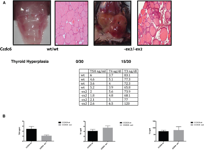 Either Ccdc6-ex2/-ex2 or Ccdc6wt/-ex2 mice did not show any evidence of illness up to 12 months of age. However, histopathological analysis of aged (17–22 month-old) mice revealed the presence of thyroid hyperplasia in 15 out of 30 Ccdc6-ex2/-ex2 mice. Histologically, atypical follicles contained eosinophilic secretory and inactive material (colloid). Follicular cells were cuboidal to columnar with indistinct cell borders, moderate amount of eosinophilic cytoplasm, one basally located oval nucleus and indistinct nucleoli (Figure 5A). In Ccdc6wt/wt mice the thyroids did not show any alteration, as well as in Ccdc6 wt/-ex2 mice (data not shown). Consistently, we found low levels of TSH and high levels of T3 and T4 hormone levels in Ccdc6-ex2/-ex2 mice with respect to Ccdc6wt/wt analyzed at the 13 month of age (Figure 5B).