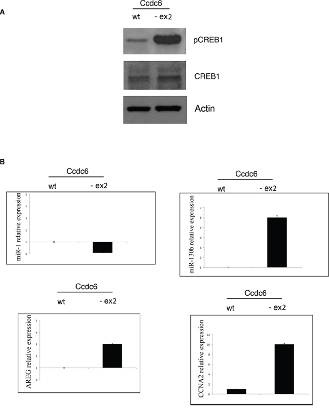 Figure 6: CREB1 transcriptional activity is increased in thyroids of Ccdc6-ex2/-ex2 mice. A. Western blot analysis of pCREB protein in total cell extracts from Ccdc6wt/wt and Ccdc6-ex2/-ex2 thyroids. Tubulin expression was used to normalize the amount of loaded proteins. B. AREG, CCNA2, miR-1 and miR-130b genes expression by qRT-PCR from Ccdc6wt/wt and Ccdc6-ex2/-ex2 thyroids. Relative expression indicates the change in expression levels in comparison with wt tissue. Data are mean ± SD of three independent experiments.