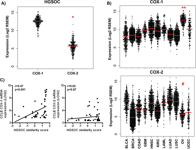Figure 1: COX-1 mRNA is over-expressed in high-grade serous ovarian tumors and representative cell lines. RNA-seq analysis of COX-1 and COX-2 expression in TCGA tumors. RSEM-normalized RNA-seq values for COX-1 and COX-2 for A. ovarian serous cancers (OV) and B. the full panel of PANCAN tumors were downloaded from cBioPortal. RSEM values were log2-transformed and plotted with the R package beeswarm (median indicated by red bar). P values were determined by the Mann-Whitney test; *p < 0.0001 compared to COX-1; **p < 0.0001 compared to all other tumor types; #p < 0.01 compared to all other tumor types. Expression of C. COX-1 and D. COX-2 mRNA in 47 ovarian cancer cell lines extracted from the Broad Institute CCLE repository (http://www.broadinstitute.org/ccle). Raw mRNA data were log2-transformed. Expression was correlated by Spearman correlation with the published HGSOC similarity score for ovarian cancer cells.