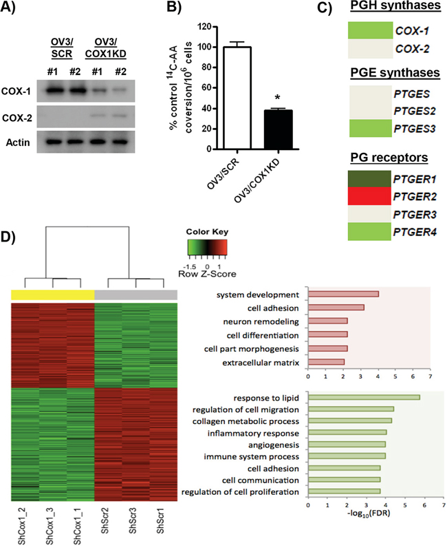Figure 3: Analysis of genes involved in PG regulation and cellular pathways regulated by COX-1 knockdown. A. Protein levels of COX-1, COX-2 and actin in OVCAR-3 clones stably transfected with shRNA targeting COX-1 (OV3/COX1KD) or control scrambled ShRNA (OV3/SCR). B. Conversion of 14C-arachidonic acid (14C-AA) to prostaglandin products in OV3/SCR and OV3/COX1KD cells after 30 min stimulation in serum-free medium. Results are expressed as a percentage of conversion in control OV3/SCR cells per 106 cells. C. RNA-seq analysis of expression of PG receptors and PGE synthases in OV3/COX1KD cells compared to control OV3/SCR cells. Light green (log2 fold change < −0.5, FDR < 0.01), dark green (log2 fold change < –1.5, FDR < 0.01), light red (log2 fold change > 0.5, FDR < 0.01), dark red (log2 fold change > 1.5, FDR < 0.01), DeSeq2 analysis. D. WebGestalt functional enrichment analysis of RNA-seq data.