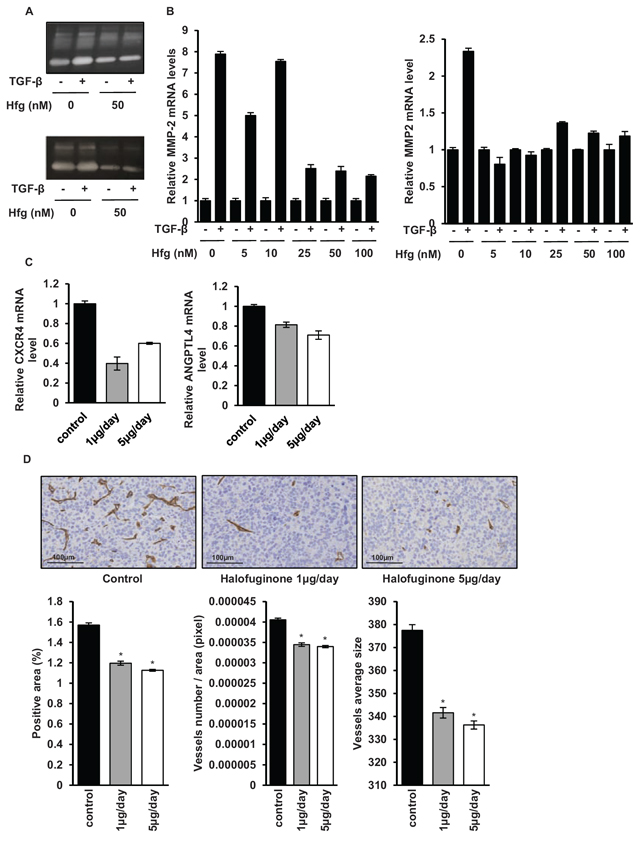 Since halofuginone is able to inhibit the TGF-β cascade in osteosarcoma cells, we evaluated the ability of halofuginone to inhibit TGF-β key targets involved in the metastatic process. As shown in Fig. 6A, zymography assay demonstrated that halofuginone strongly reduces the activation of MMP-2 in osteosarcoma cells, a metalloproteinase that plays a crucial role in the cell invasion process. Moreover, as shown in Fig. 6B, RT-qPCR analysis indicated that halofuginone inhibits the ability of TGF-β to induce MMP-2 expression. In addition, RT-qPCR analysis from mice biopsies indicated that the expression by tumor cells of CXCR4 and ANGPTL4, two TGF-β target genes identified as key players to prime cancer cells towards the lungs, were both reduced when mice were treated with halofuginone (Fig. 6C). Finally, immunohistochemical staining for the endothelial marker CD146 in mice tumor samples showed that halofuginone treatment significantly decreased the angiogenic process compared to the untreated group by decreasing the number of vessels and their average size (Fig. 6D).