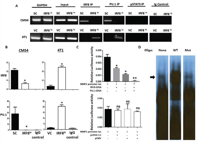 To explore the possibility for a direct binding interaction between IRF8 and elements of the MMP3 promoter, we first visually inspected the murine MMP3 promoter in silico for IRF8 binding sites. In doing so, we identified a putative IRF8 binding site reflecting both ISRE (interferon-stimulated response element) and EICE (Ets/IRF composite element) motif characteristics [38] starting at position -1137 upstream from the transcriptional start site (GGAATGGAAA; Suppl. Fig. 1). ChIP assays were then performed using the IRF8-expressing or IRF8-deficient CMS4 cells. The protein-DNA complex was incubated with a ChIP-certified anti-IRF8 antibody, followed by PCR amplification of the MMP3 promoter region using primers surrounding a putative ISRE site located -1137 bp upstream from the transcription start site (Suppl. Fig. 1). Using the CMS4-SC cells, we found a direct binding interaction between IRF8 and the MMP3 promoter, based on the appearance of a PCR product reflecting the expected fragment size and subsequent quantification of these data which revealed a significant increase in the ChIP signal relative to the input DNA (Fig. 2A and 2B). Specificity for this IRF8-MMP3 axis was shown in two ways. First, no PCR product was detectable using the isotype control antibody or an antibody reactive against an unrelated transcription factor (i.e., pSTAT3) and, secondly, little to no PCR product was detectable in CMS4-IRF8lo cells (Fig. 2A). ChIP experiments were then performed using the 4T1 system and, as with the CMS4 system, a direct binding interaction was shown using 4T1-IRF8hi cells (Fig. 2A and 2B). An additional control included a ChIP-PCR reaction for an unrelated genomic region (i.e., GAPDH), which supported the integrity of the input DNA in these preparations.