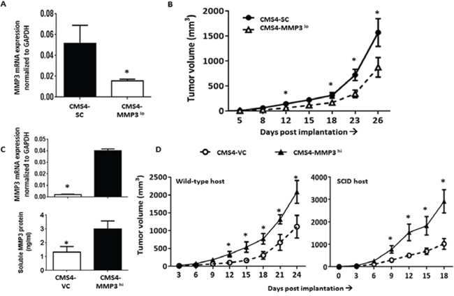 Next, we sought to molecularly alter tumor-derived MMP3 levels in order to specifically focus on the role of MMP3 in tumor progression. Although MMP3 levels have been originally linked to tumor initiation/promotion [27], less is known about their role in subsequent stages of the neoplastic process. Initially, we selected CMS4 cells and either stably silenced (CMS4-MMP3lo) or overexpressed (CMS4-MMP3hi) the mouse MMP3 gene. Despite the fact that CMS4 cells expressed low basal levels of MMP3, silencing MMP3 further decreased tumor growth (Fig. 4A & 4B). Conversely, overexpressing MMP3 (Fig. 4C, at RNA and protein levels) enhanced in vivo tumor growth (Fig. 4D; Suppl. Fig. 4). Again, this effect was observed in both wild-type and SCID mice (Fig. 4D), and modifying MMP3 levels did not alter in vitro proliferation or MHC class I expression (e.g., H-2Kd; Suppl. Fig. 6).