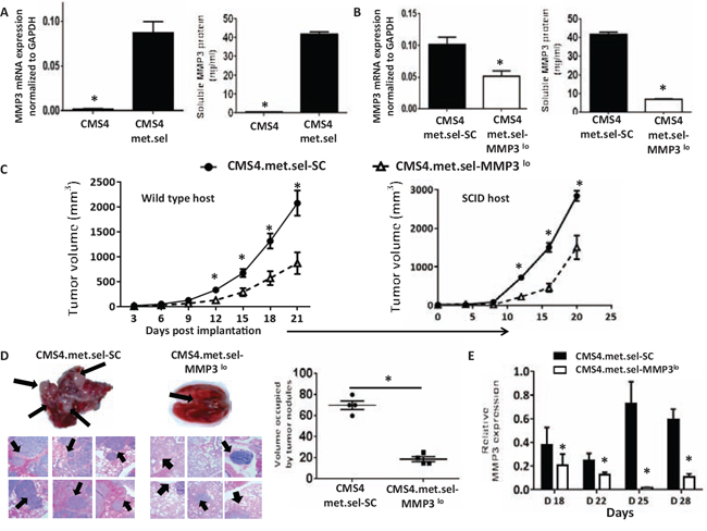 Figure 5: Modulating tumor-derived MMP3 levels alters CMS4-met.sel tumor growth. A. Comparison of basal MMP3 expression between CMS4 and CMS4.met.sel at RNA (qPCR, left panel) or protein (ELISA, right panel) levels. B. Knockdown of MMP3 in CMS4.met.sel cells compared to the SC population as shown at RNA (qPCR, left panel) or protein (ELISA, right panel) levels. C. Tumor growth in wild-type mice (n = 18 per tumor cell line; left) or SCID mice (n = 5 per tumor cell line; right). D. Experimental lung metastases as shown by H&E-stained lung tissue sections (left), followed by quantification of approximate volume of lung occupied by tumor (right). Arrows indicate examples of lung tumor nodules. E. MMP3 levels in tumor explants at different time points post-implantation, as measured by qPCR. *P < 0.05 (experimental replicates).