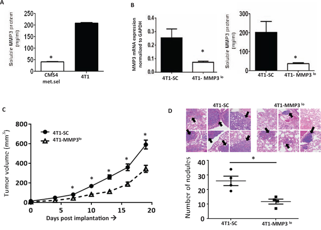 Figure 6: Modulating tumor-derived MMP3 levels alters 4T1 tumor growth. A. Endogenous MMP3 production levels in 4T1 cells compared to CMS4.met.sel cells, as shown by ELISA. B. Knockdown of MMP3 in 4T1 cells compared to SC population as shown at RNA (qPCR, left panel) or protein (ELISA, right panel) levels. C. Tumor growth in wild-type mice (n = 18 for each tumor cell line). D. Experimental lung metastases as shown by H&E-stained lung tissue sections (upper) followed by histologic quantification of tumor nodules (lower). Arrows indicate examples of lung tumor nodules (n = 4 per group). *P < 0.05.