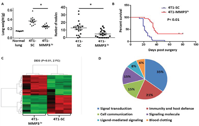 Figure 7: Tumor-derived MMP3 impacts spontaneous metastasis. A. Quantification of spontaneous lung metastasis of the indicated 4T1 cell population with primary tumors left intact. Data collected at endpoint when mice harbored similar primary tumor volumes (4T1-SC: 1794 ± 147 mm3; 4T1-MMP3lo: 1798 ± 143 mm3) and quantified by lung weight or lesion count of H&E-stained lung tissue sections. Each data point represents a single mouse. B. After surgical removal of the primary tumor (i.e., 4T1-SC: 113 ± 9.2 mm3, 4T1-MMP3lo: 126 ± 5.5 mm3), mice were followed for survival based on the appearance of signs/symptoms of morbidity (n = 21 mice per tumor cell line). C. Gene expression profiling of the indicated 4T1 tumor cell population in biologic triplicates, as shown by heat-map of differentially expressed genes (n = 58; > 2-fold up or down; P < 0.01). D. Data in C regrouped based on gene ontogeny analysis. Microarray studies were performed using the MouseWG-6 whole-genome gene expression array.