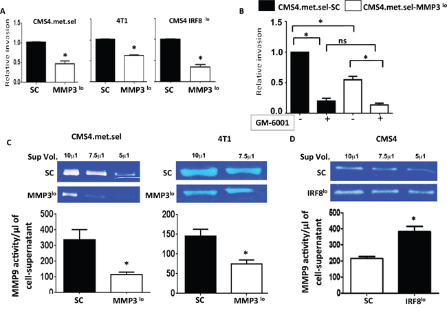 Secondly, we investigated the impact of altering MMP3 expression levels on invasive potential. Indeed, we observed a direct correlation between endogenous MMP3 levels and invasive phenotype in all tumor models tested, as measured by in vitro invasion assays (Fig. 8A). We then made use of the broad spectrum MMP inhibitor (GM-6001) to verify that invasive ability was MMP-dependent. Using the CMS4-met.sel model, we found that GM-6001 significantly inhibited invasive ability, including the residual activity of the MMP3lo subline (Fig. 8B). One well-known substrate for MMP3 is pro-MMP9 [44], which has been reported to be a potent mediator of tumor progression. Therefore, to determine whether modulation of MMP3 levels in turn affected MMP9 activity, we measured MMP9 activity by zymography. Overall, we found a direct correlation between MMP3 expression and MMP9 activity (Fig. 8C). In both CMS4.met.sel and 4T1 models, the corresponding MMP3lo sublines showed significant declines in MMP9 activity. In contrast, in the CMS4-IRF8lo model, MMP9 activity was significantly elevated compared to the SC control (Fig. 8D). These data indicated that modulation of MMP3 expression impacts tumor progression in a cell-intrinsic manner.