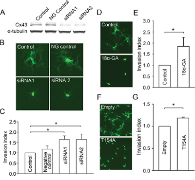 Figure 1: Effects of glioma-glioma gap junctions on glioma invasion. A. Western blot showing siRNA mediated knockdown of Cx43 expression in U87MG cells. NG control: negative control siRNA. B. siRNA mediated knockdown of Cx43 expression in U87MG cells decreases gap junction dye coupling. Scale bar, 10 μm. C. Effect of siRNA mediated knockdown of Cx43 in U87MG cells on glioma invasion; Cx43 siRNA increases invasion. Mean ± SEM, n = 4, *P < 0.05. D. 18α-GA (50 μM; 1 h) effectively blocked gap junction dye coupling between glioma cells. Scale bar, 10 μm. E. Inhibition of glioma-glioma gap junctions by 18α-GA increased glioma invasion. Mean ± SEM, n = 5, *P < 0.05. F. Expression of dominant-negative mutant Cx43-T154A in U87MG cells decreased gap junction dye coupling. Scale bar, 10 μm. G. Glioma invasion is increased by expression of the dominant negative Cx43-T154A in U87MG cells. Mean ± SEM, n = 4, *P < 0.05.
