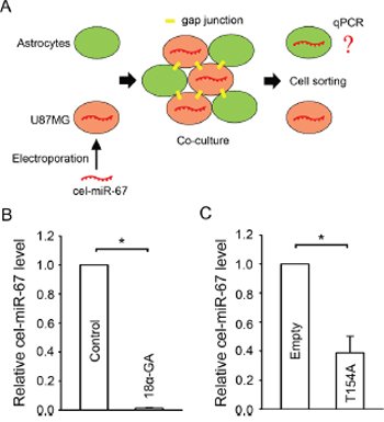 Figure 3: Gap junction mediated miRNA transfer between glioma cells and astrocytes. A. Schematic diagram illustrating the procedure for confirming cel-miR-67 transfer between glioma cells and astrocytes. B. Normalized cel-miR-67 level in astrocytes after co-culture with U87MG cells loaded with cel-miR-67. 18α-GA blocks the transfer of cel-miR-67 to astrocytes. Mean ± SEM, n = 3, *P < 0.05. C. Normalized cel-miR-67 level in U87MG cells after co-culture with astrocytes loaded with cel-miR-67. The Cx43-T154A mutant greatly reduces transfer of cel-miR-67 to astrocytes. Mean ± SEM, n = 3, *P < 0.05.