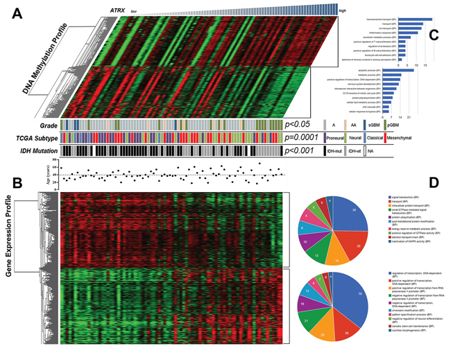 Figure 2: Clustering analysis of both DNA methylation and mRNA expression profiles in astrocytic tumors. Patterns of mRNA expression and DNA methylation were associated with ATRX in astrocytic tumors using one-dimensional hierarchical clustering analysis A. and B. Functional enrichment analysis of associated genes, indicating the functional roles of gene sets in different subgroups. Enrichment results for biological processes were obtained from the GO database. The orders of biological processes listed in the circle or histogram are based on the number of targets annotated in the biological process C. and D.