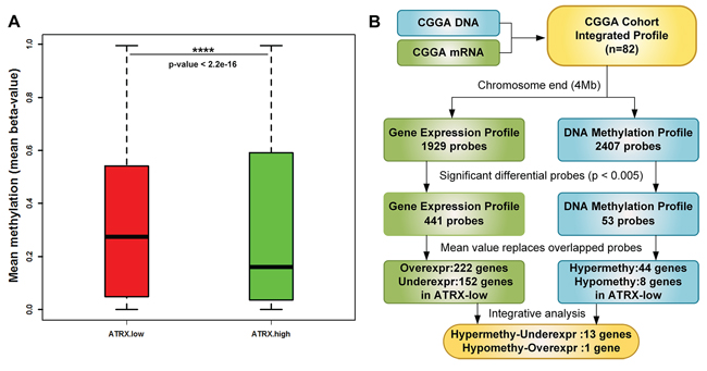 Figure 3: Strategy to identify significant genes of both DNA methylation and gene expression profiles. According to Sturm et al.’s work [18], we screened the probes within 4Mb bases to chromosome end. Mean methylation value within 4 Mb to the chromosome end normalized to the mean overall methylation value. Significant differences (p < 2.2e-16) between these two subgroups are indicated A. Tumors in ATRX-low cluster specifically showed widespread hypermethylation at chromosome end compared with ATRX-high subgroup.1929 probes from gene expression profile and 2407 probes from DNA methylation profile were analyzed, respectively at the chromosome end. We identified that 441 differential probes from gene expression profile and 53 differential probes from DNA methylation profile (p < 0.005). Comparison of the 52 putative target genes of differential methylation and the 374 genes of differential expression allowed the detection of gene loci that experienced both concurrent changes in ATRX-low tumors. In total, 18 genes were both differentially methylated and differentially expressed: 17 of these were hypermethylated, and 1 were hypomethylated. Thirteen of the genes that were hypermethylated in ATRX-low also featured downregulated gene expression B.