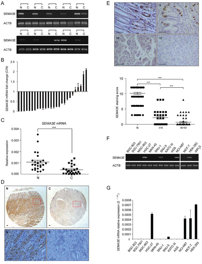 Figure 1: Sema3E is down-regulated in gastric cancer and gastric cancer cell lines. A. RT-PCR indicates the expression of SEMA3E mRNA in 10 pairs of human gastric cancer and adjacent nontumor samples. B. Real-time PCR indicates the expression of SEMA3E mRNA in 26 pairs of human gastric cancer and corresponding noncancer samples. The expression level of SEMA3E was normalized to an endogenous control (GAPDH). C. Statistical analysis was performed by paired t-test to compare the expression level of SEMA3E presented in (B). D. Representative Sema3E immunohistochemistry on sections of paired gastric cancer and adjacent noncancer tissue is shown. The bottom panel is enlarged from the boxed region of the top image. Scale bar is 50 μm. E. Representative Sema3E immunohistochemistry on sections of TNM I to TNM IV gastric cancer is shown. Decreased Sema3E is correlated with the progression of gastric cancer. In TNM III and TNM IV stages of gastric cancer, Sema3E was barely detectable. Scale bar is 50 μm. F and G. The expression of SEMA3E was determined by RT-PCR and real-time PCR in gastric cancer cell lines, MCF-7 and HEK-293 cells. ACTB and GAPDH were used as endogenous controls respectively. The data are presented as the mean ± SD. ***P < 0.001 versus the control.