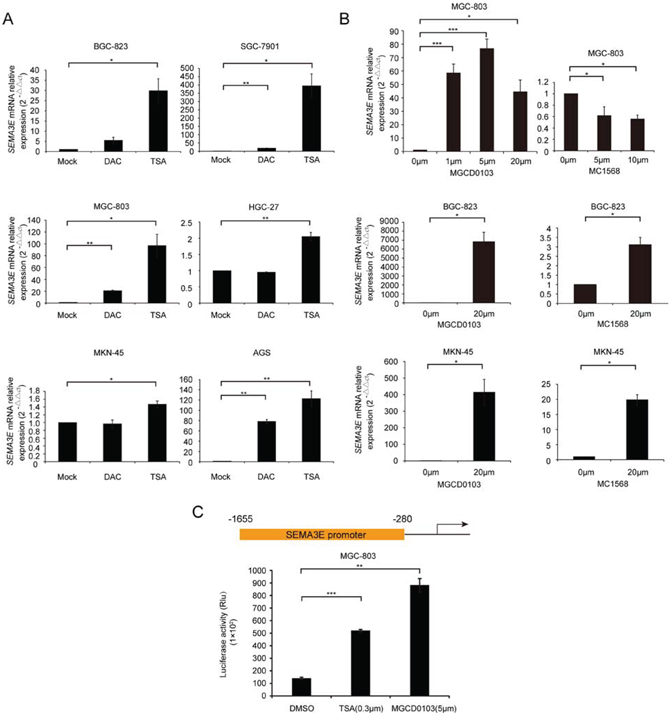 Figure 2: Epigenetic regulatory mechanisms are involved in SEMA3E transcription. A. The re-expression of SEMA3E in gastric cancer cell lines treated with DMSO, DAC or TSA was evaluated by real-time PCR. GAPDH was used as endogenous control. B. The re-expression of SEMA3E in gastric cancer cell lines treated with DMSO, MGCD0103 or MC1568 was evaluated by real-time PCR. GAPDH was used as endogenous control. Statistical analysis was conducted with paired t-test. C. The -1655 bp to -280 bp sequence upstream of SEMA3E transcription initiation site was likely SEMA3E’s promoter, as predicted by GeneCopoeia. Luciferase activity of SEMA3E promoter in MGC-803 cells treated with TSA or MGCD0103 was assessed with Luciferase Assay System. DMSO treatment was used as control. The data are presented as the mean ± SD. ***P < 0.001, **P < 0.01, *P < 0.05 versus the control.