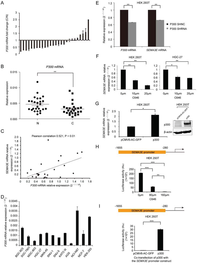 Figure 3: The histone acetylation enzyme p300 plays a role in the regulation of SEMA3E transcription. A. Real-time PCR indicates the expression of P300 mRNA in 26 pairs of human gastric cancer and corresponding noncancer samples. The expression level of P300 was normalized to an endogenous control (GAPDH). B. Statistical analysis was performed by t-test to compare the level of P300 presented in (A). C. The correlation of P300 and SEMA3E in 24 pairs of gastric cancer and corresponding adjacent normal tissues. D. The expression of P300 mRNA in gastric cancer cell lines, MCF-7 and HEK-293 cells was determined by real-time PCR. GAPDH was used as endogenous control. E. The expression level of SEMA3E after p300 knockdown in HEK 293T was determined by real-time PCR and normalized to GAPDH. Statistical analysis was performed by paired t-test. F. The expression level of SEMA3E in HEK 293T and HGC-27 cells treated with C646 was determined by real-time PCR and normalized to GAPDH. G. The level of SEMA3E in HEK 293T with p300 overexpression was determined by real-time PCR and normalized to GAPDH. H. Luciferase activity of SEMA3E promoter in HEK 293T cells that were treated with C646. I. Luciferase activity of SEMA3E promoter in HEK 293T co-transfected with p300 was analyzed. Discrepancies in the transfection efficiency between the GFP and the p300 group were eliminated by sorting the same number of transfection-positive cells with BD FACS CANTO II flow cytometer cell sorting system (BD Biosciences, USA) according to GFP tag. Statistical analysis was performed by paired t-test. The data are presented as the mean ± SD. ***P < 0.001, **P < 0.01, *P < 0.05 versus the control.